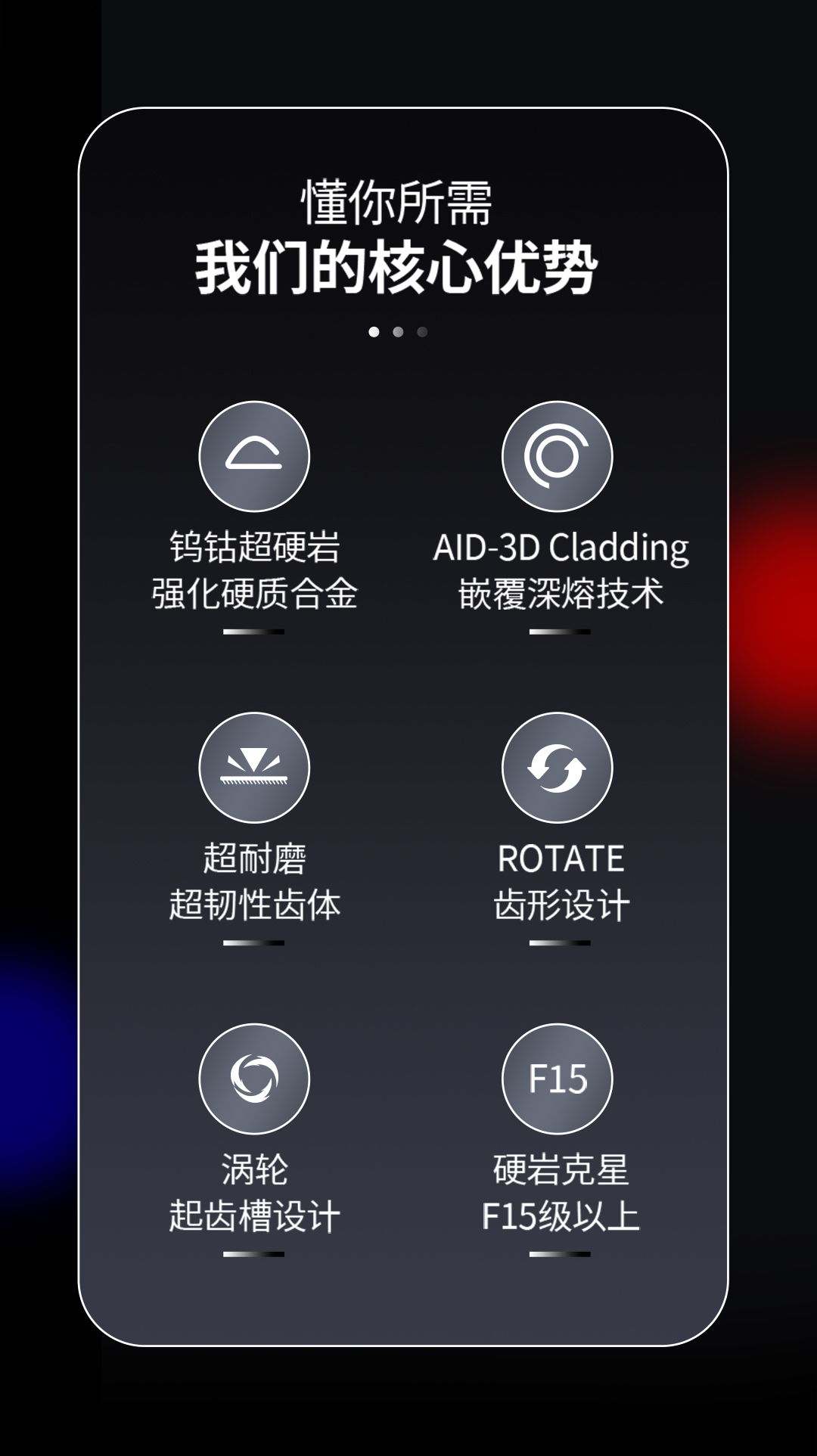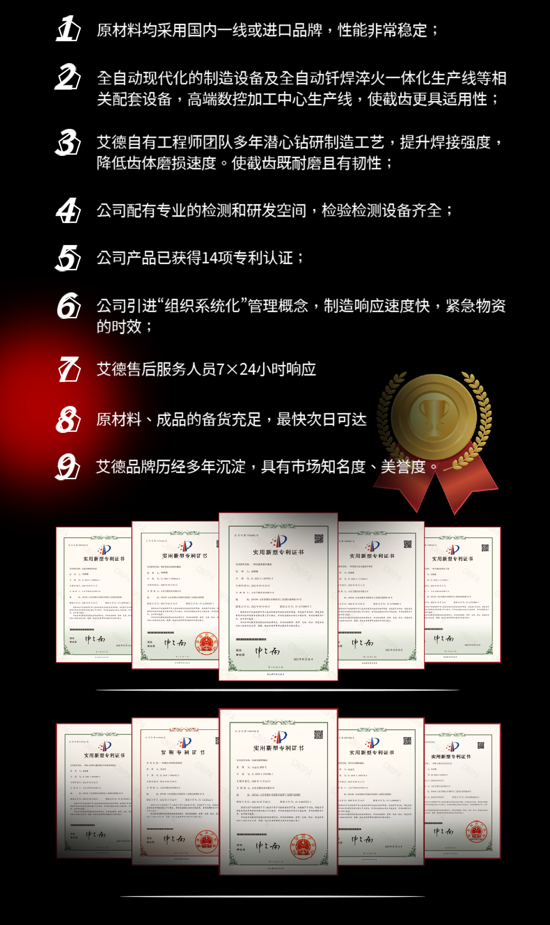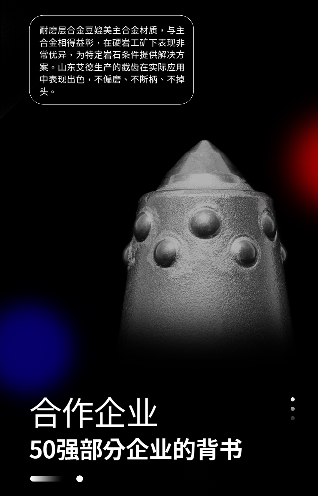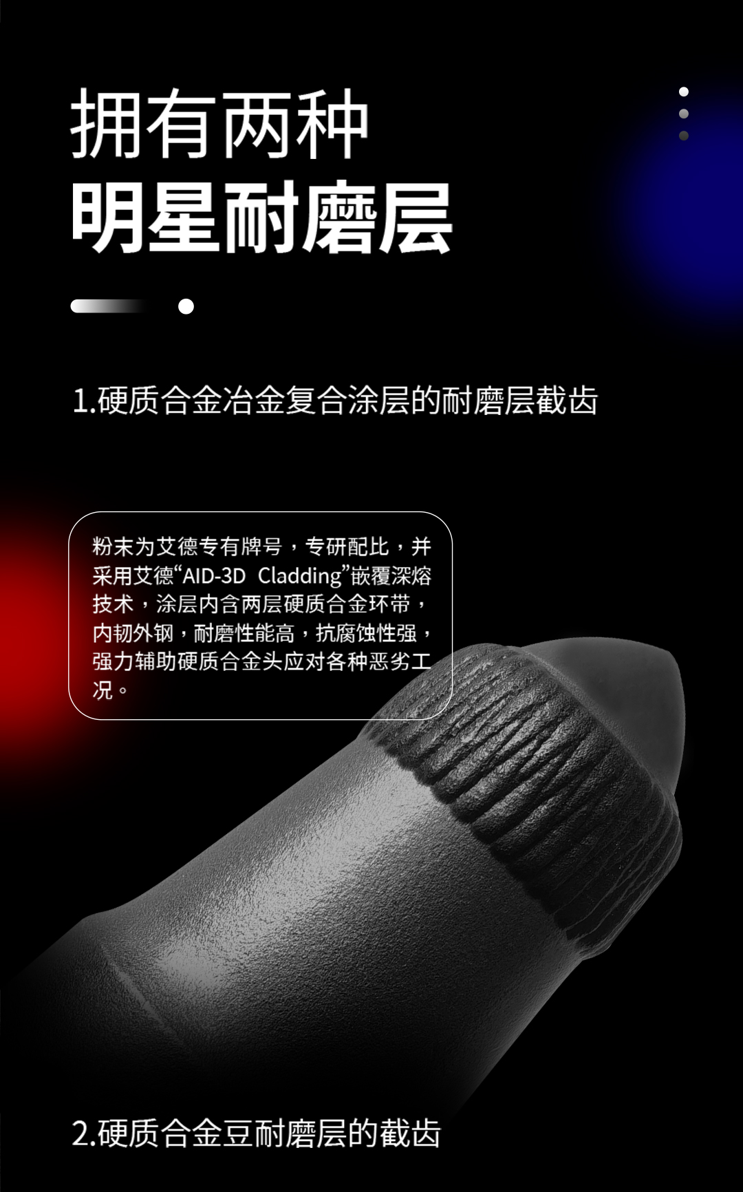 产品材质:钨钴硬质合金(合金头); 碳化钨,硬质合金冶金复合材料(耐磨层); 42Crmo合金钢(齿体)