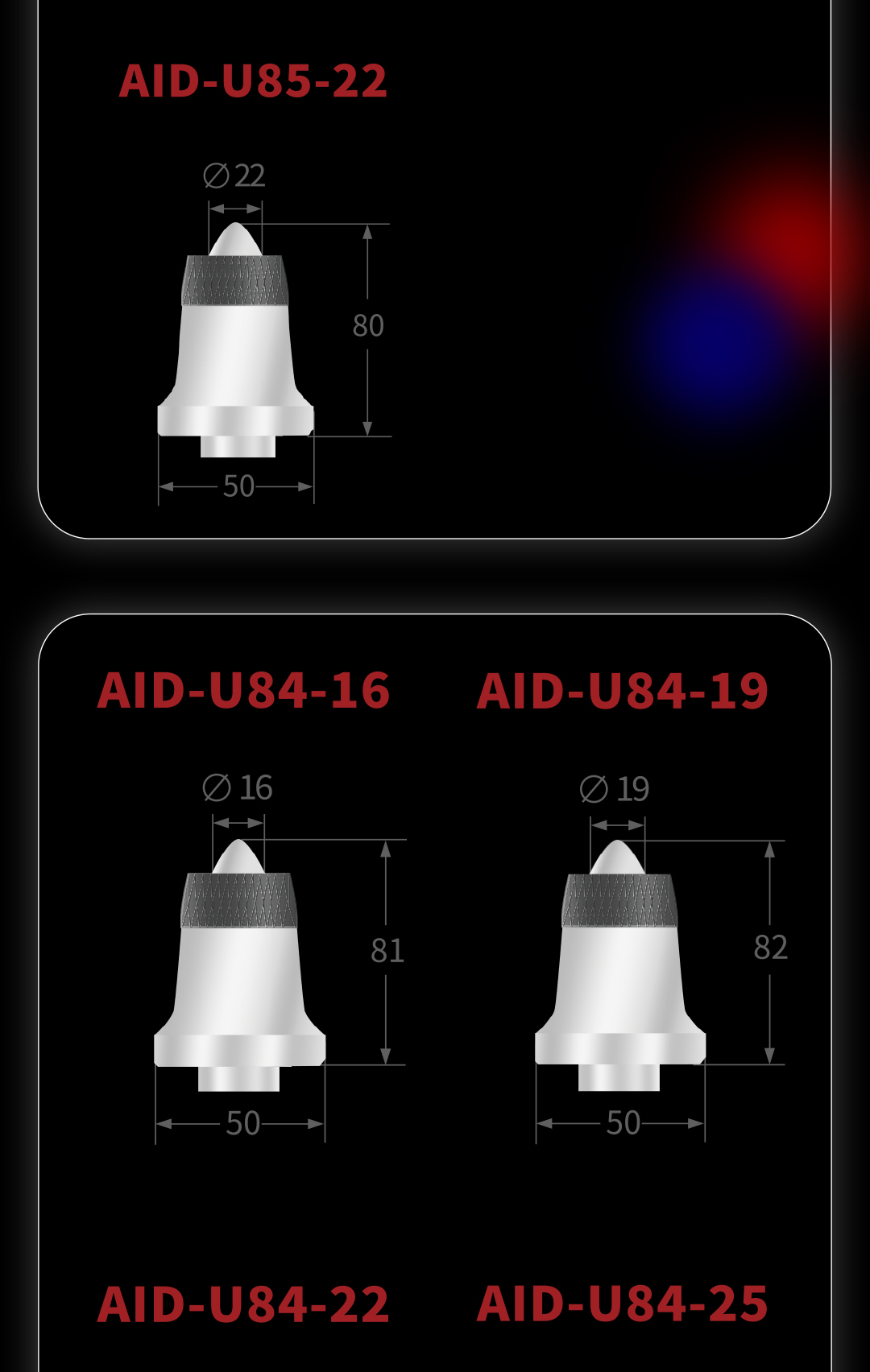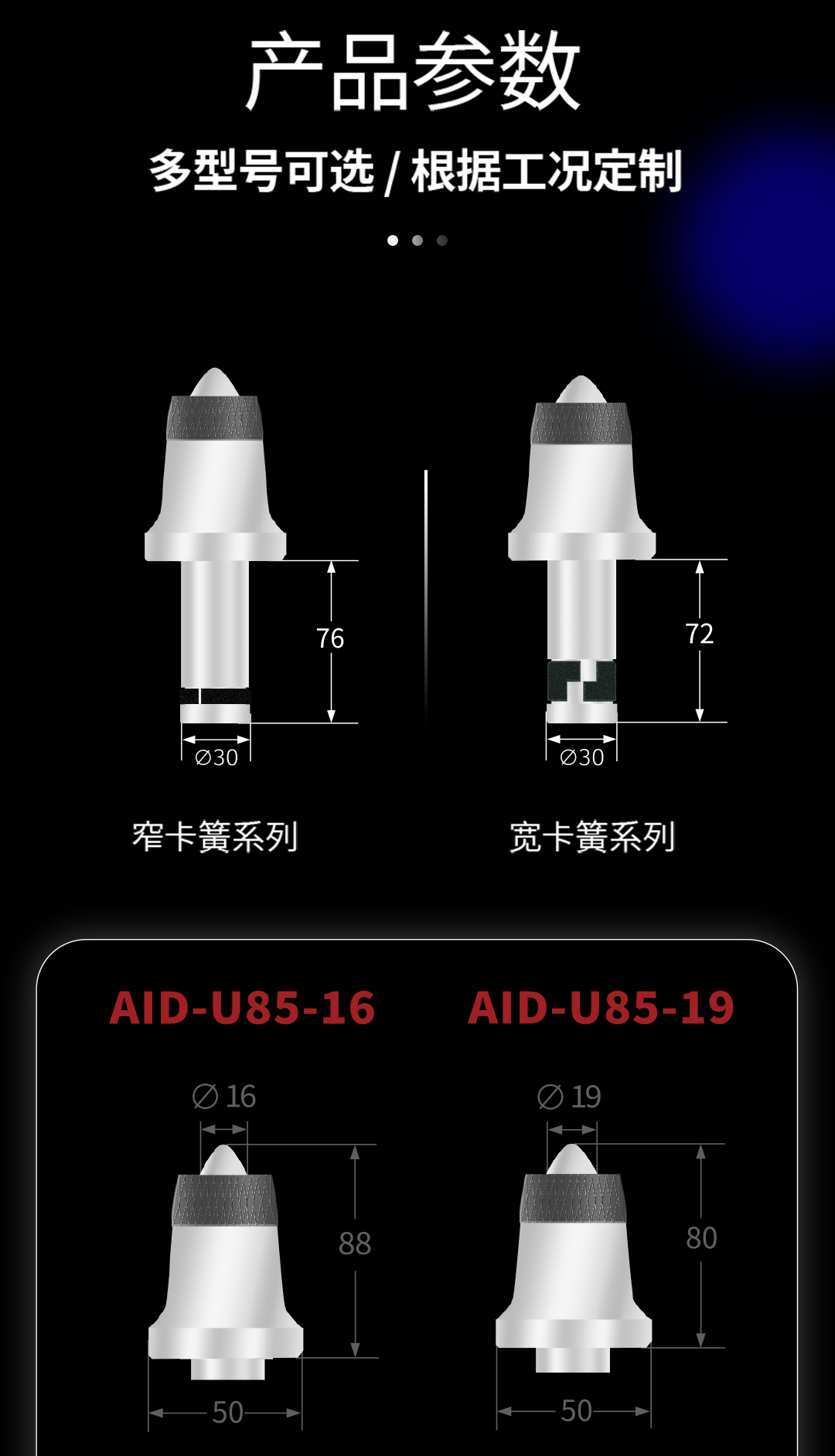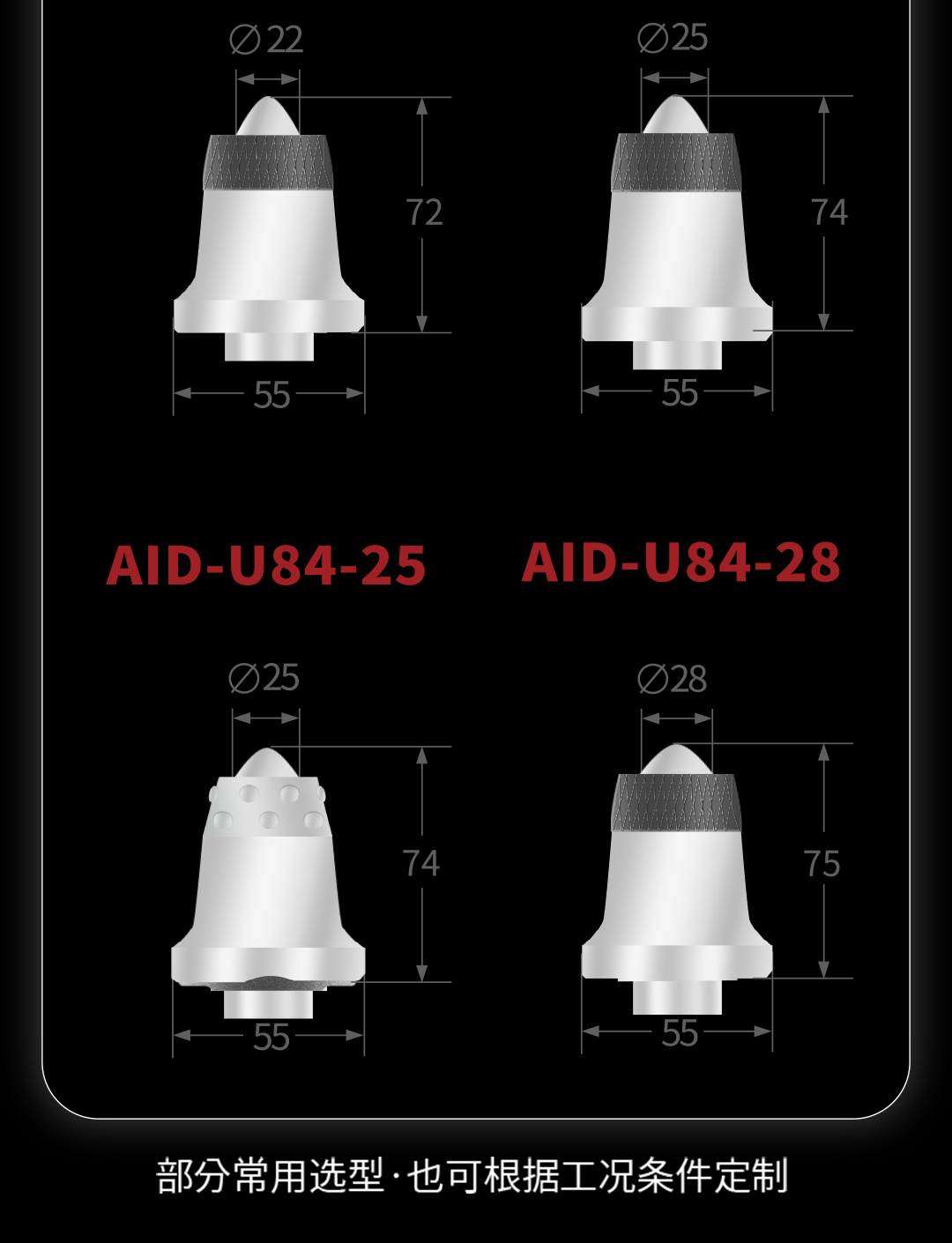 产品特性:艾德U80系列采煤机截齿适用于中小型功率采煤机;标准肩宽提供齿套和齿座保护;镶嵌最新硬质合金,渗透力强、截割效率高;高硬度耐磨保护主合金,提高截齿使用寿命; 硬质合金选配范围16mm~30mm。