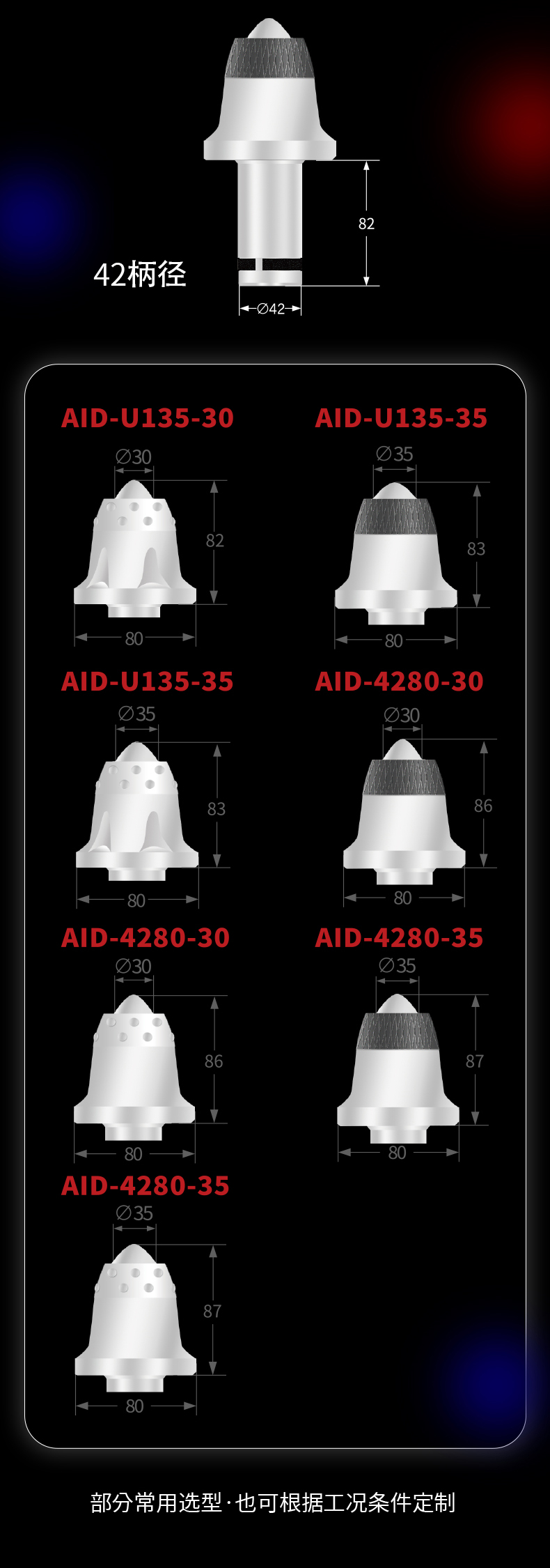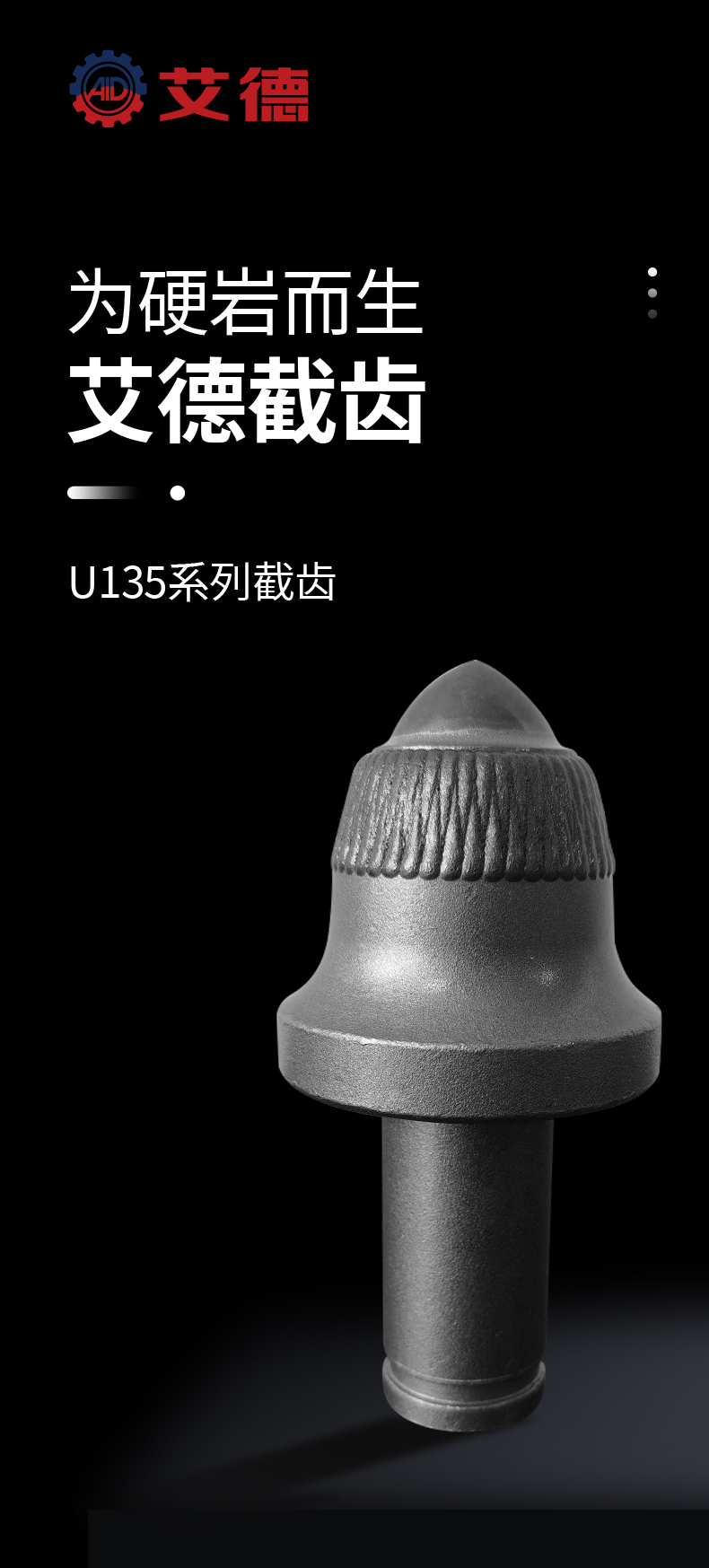 产品特性:艾德U135掘进机截齿属于硬岩级截齿,适合重型~超重型工况;标准主体设计、宽大法兰肩提供最大齿座保护;适用于腐蚀性高的岩石状况和断层级全岩巷道;隧道用截齿、抗冲击强、渗透性好;硬质合金选配范围19mm~35mm。