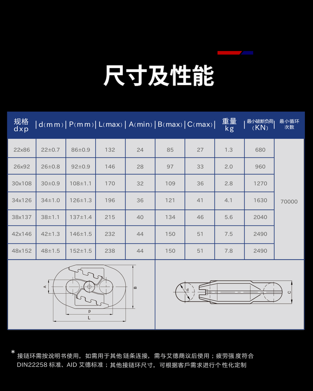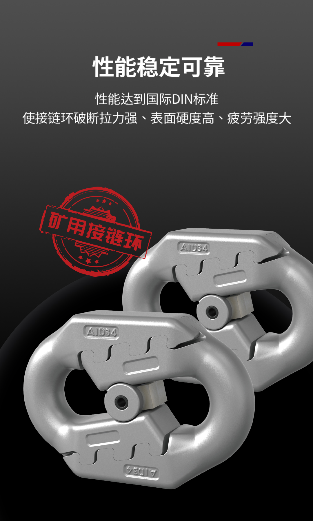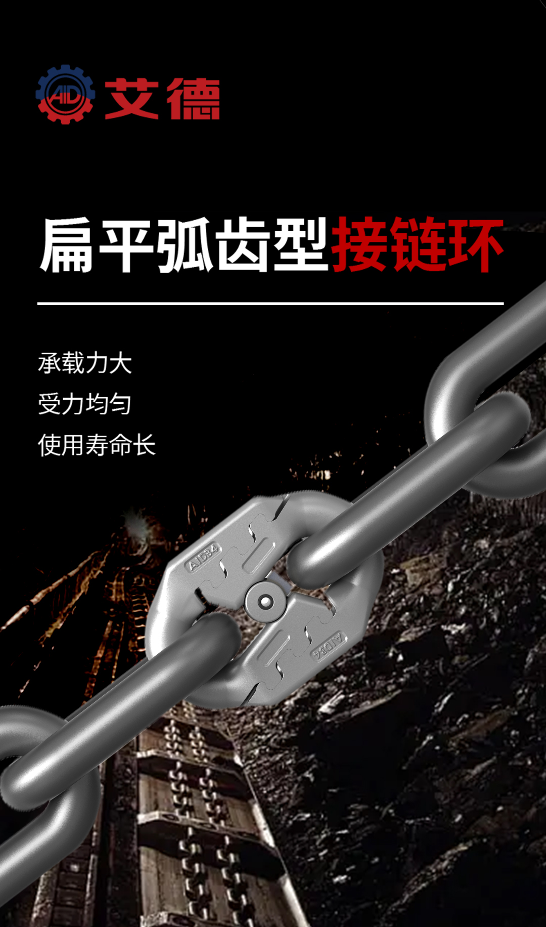 产品特性:艾德扁平弧齿型接链环通过采用优质54合金钢材质,使用智能加工中心生产,经过自主研发热处理工艺等,让接链环具有高强度、高韧性、耐磨损、耐腐蚀、良好的冷弯能力、较高的破断拉力等综合机械性能。
