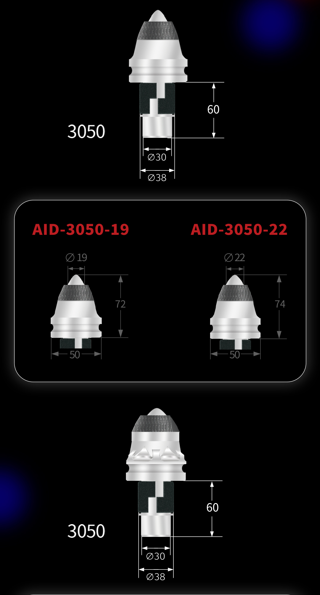 产品特性:艾德3050/3055旋挖机截齿适用于城市建设等基础施工;标准主体设计、宽大法兰肩提供最大齿座保护;抗高温火花、高耐磨、更换迅速;抗冲击强、渗透性好;硬质合金选配范围19mm~30mm。